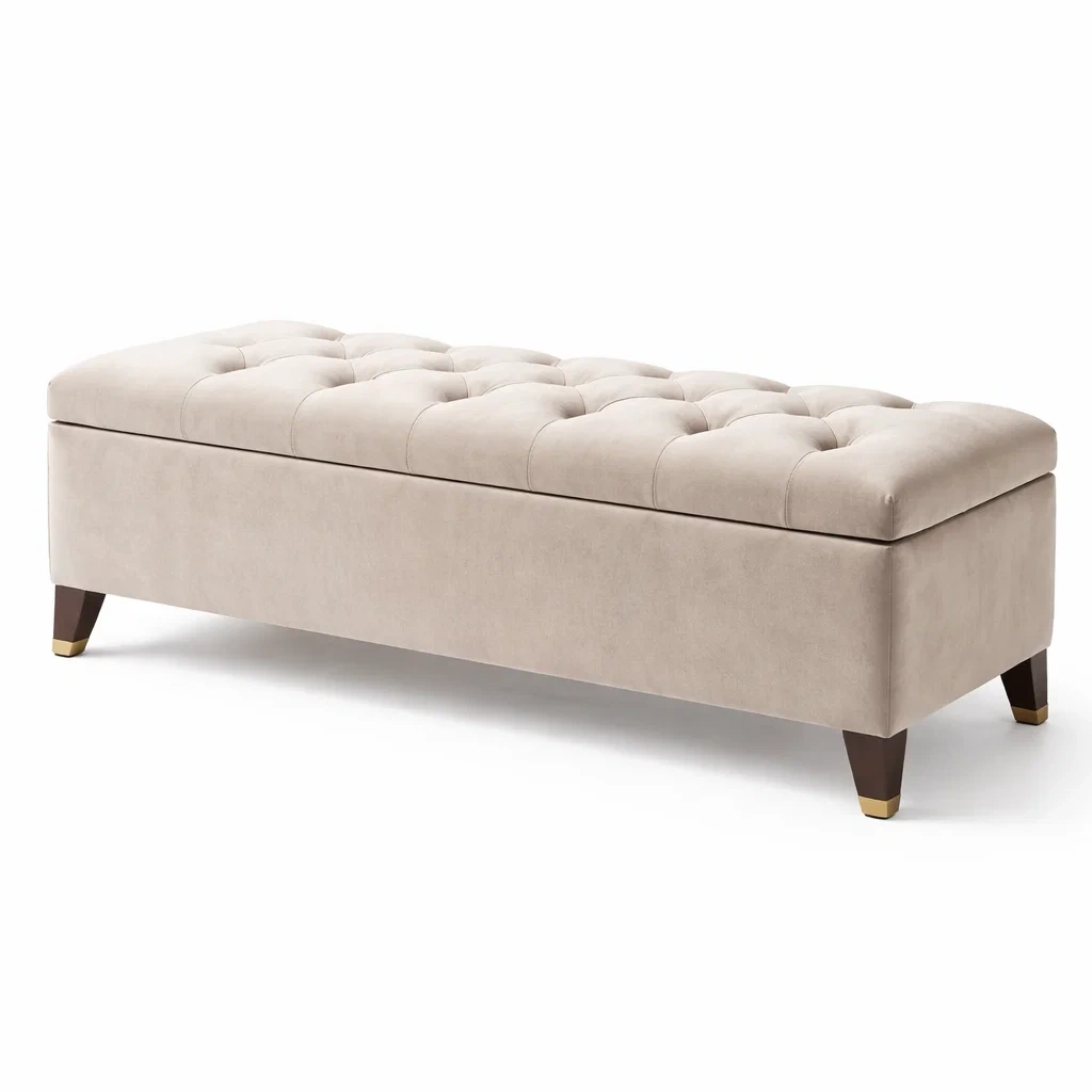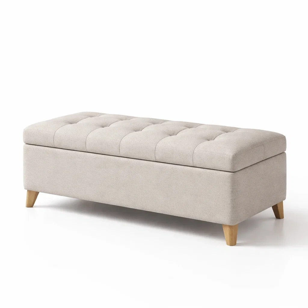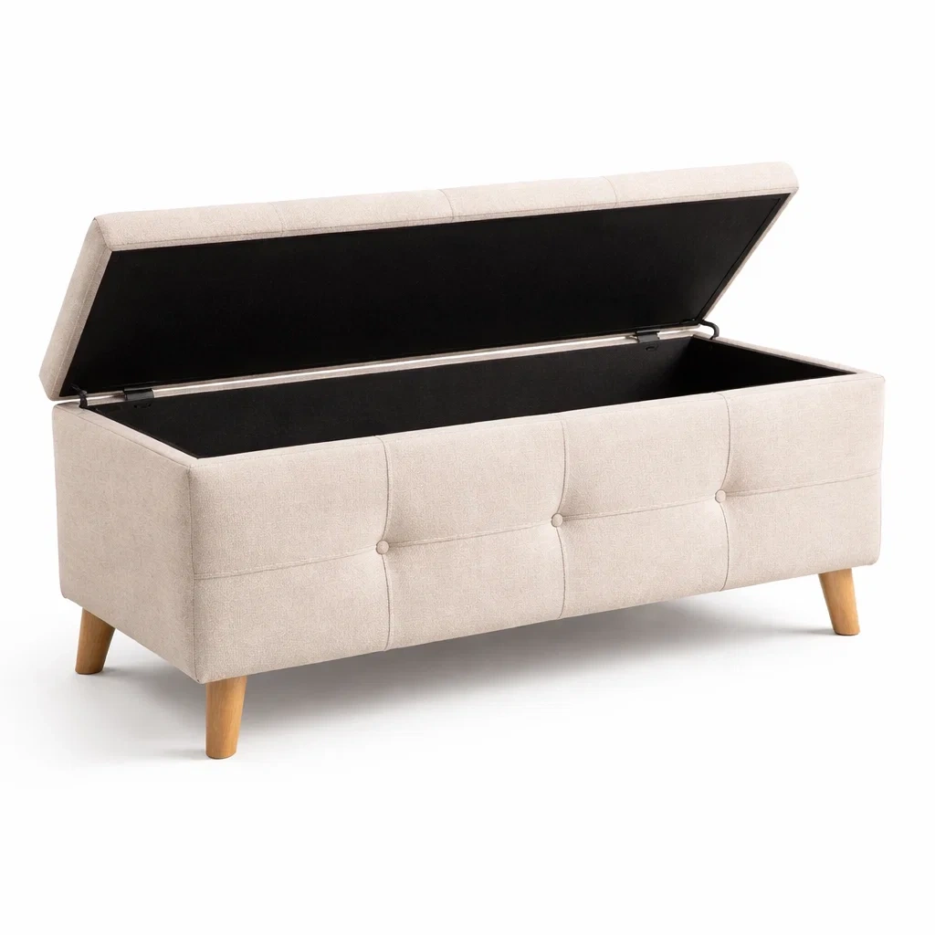 Banc de rangement en tissu lin beige avec pieds en bois 130 cm
