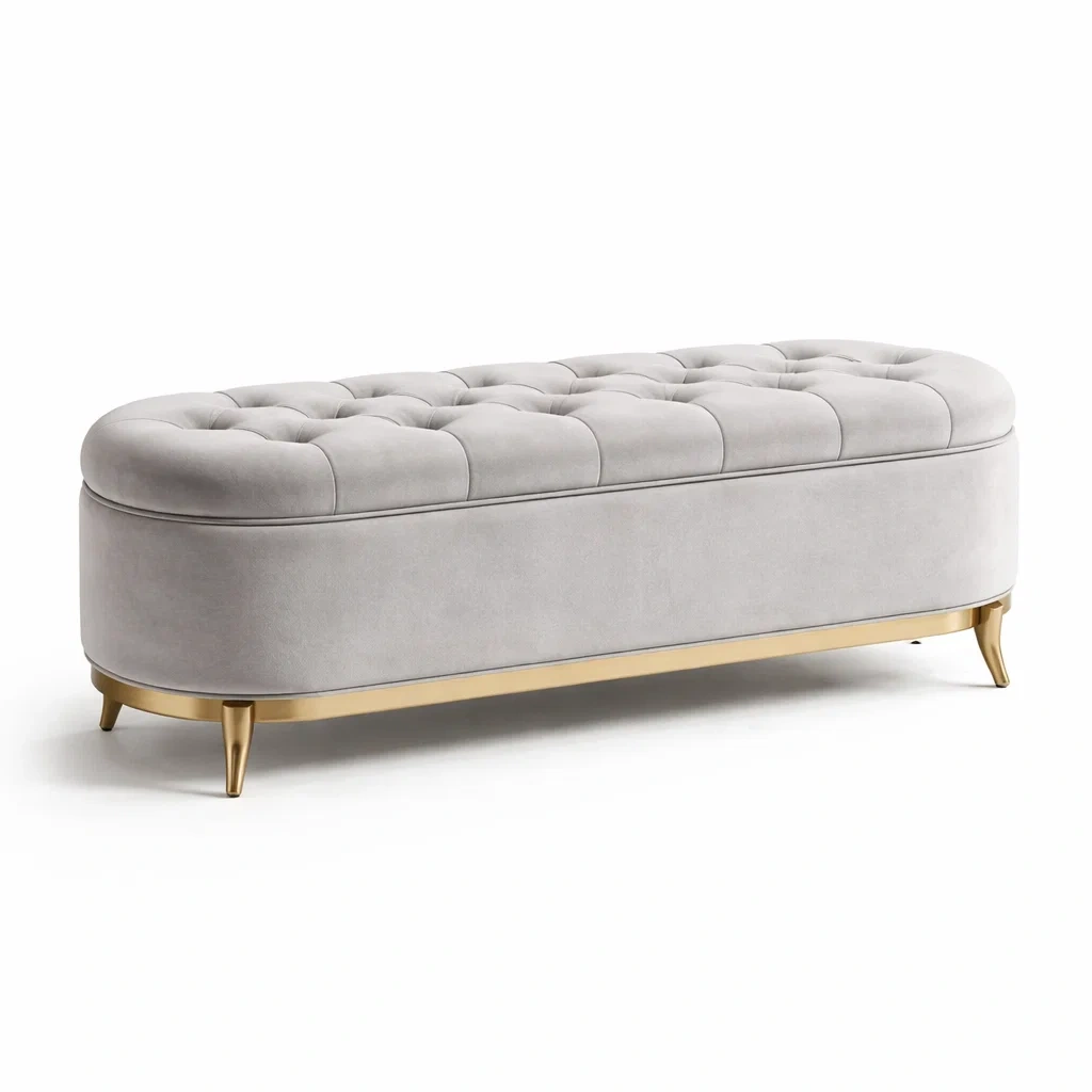 Banc de rangement en velours gris avec pieds en bois noir et embout doré