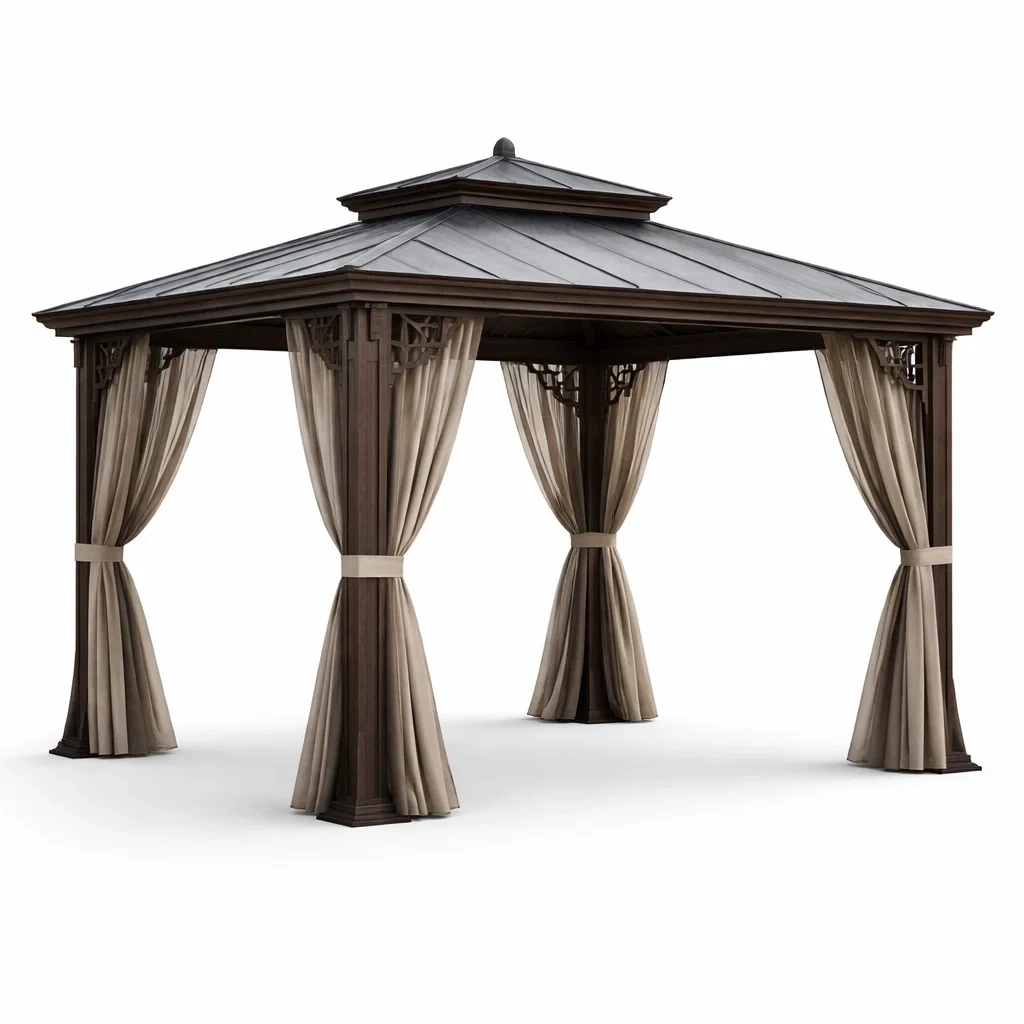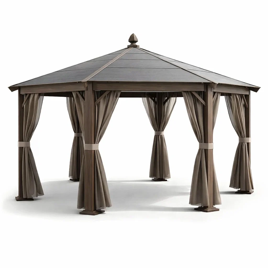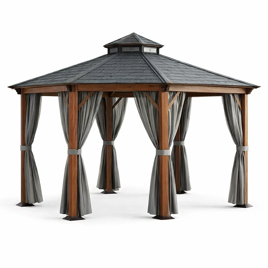 Pergola en bois avec rideaux en polyester beige