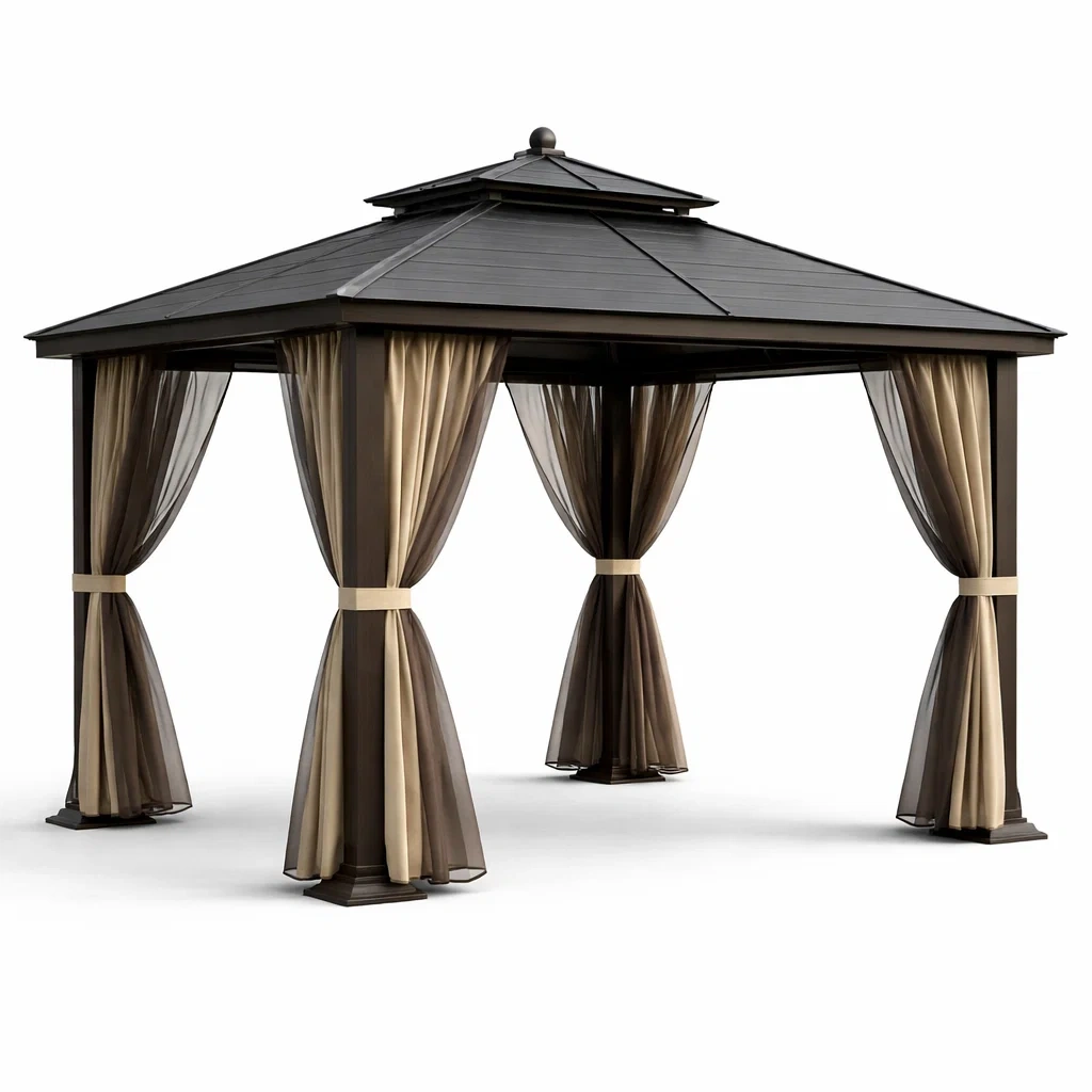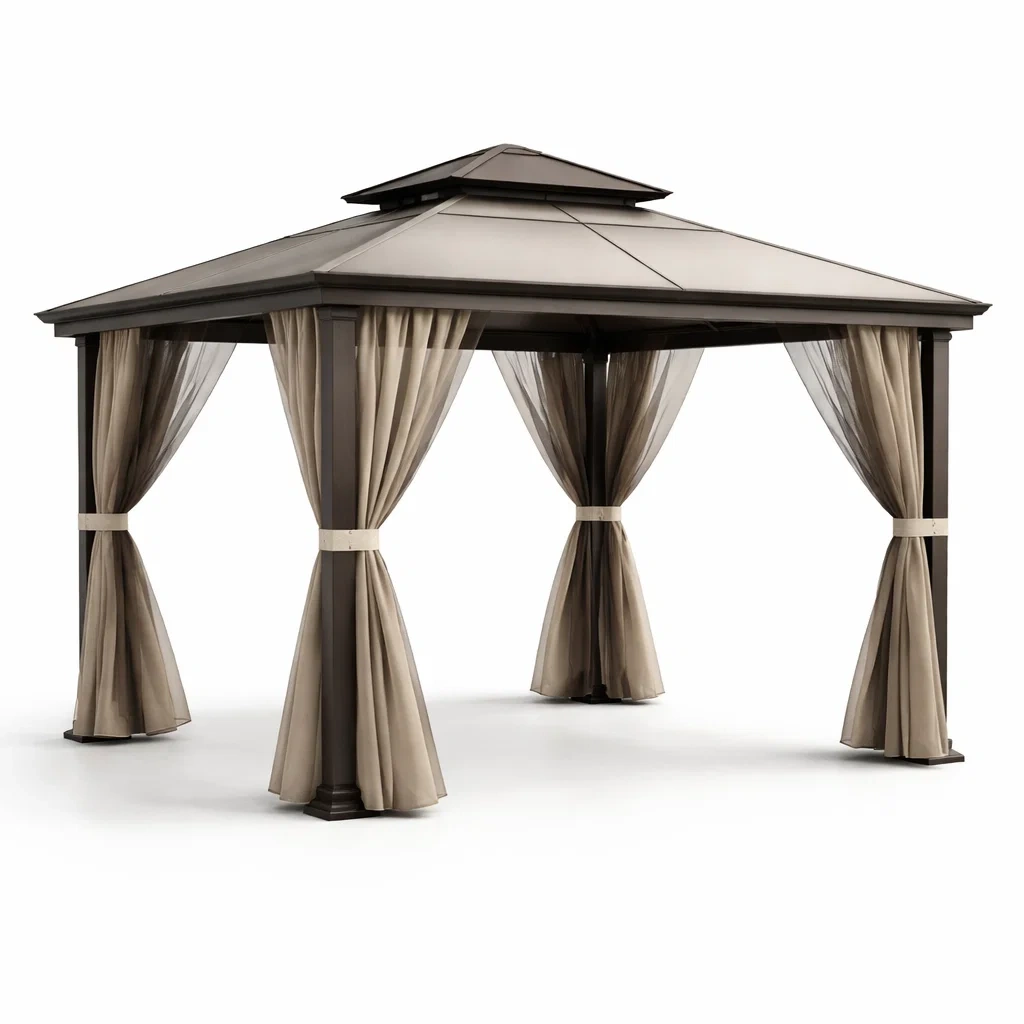 Pergola en acier avec rideaux en polyester brun et beige