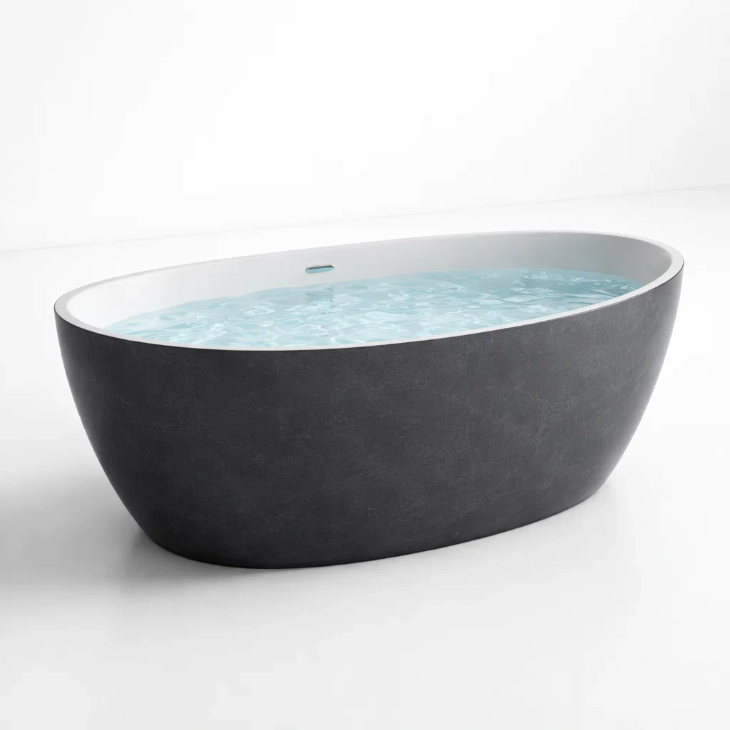 Cette baignoire autoportante est fabriquée en résine acrylique, avec l'extérieur en noir et l'intérieur en blanc.