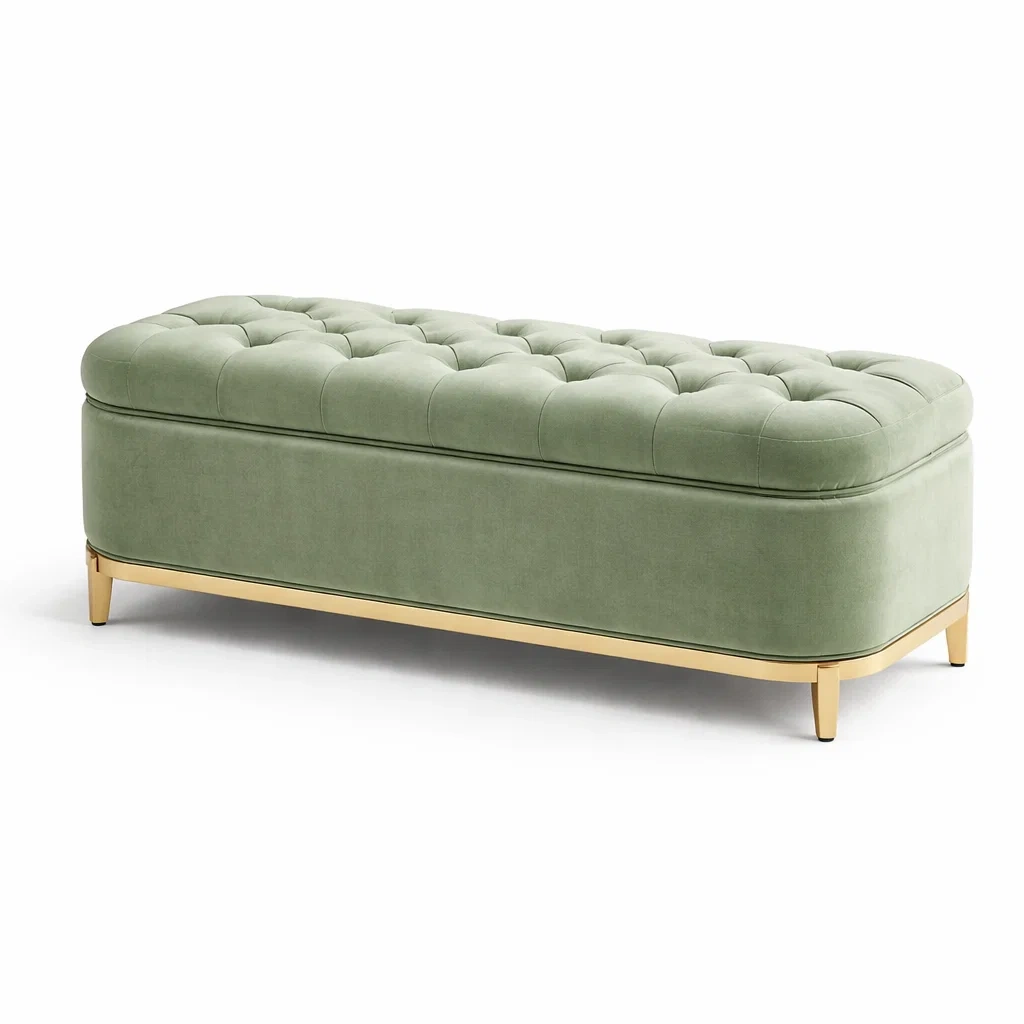 Ce banc de rangement est conçu avec une finition en velours vert et une structure métallique dorée. Les dimensions sont de 120 cm de longueur, 45 cm de largeur et 45 cm de hauteur. Le rembourrage interne est en mousse. La surface est lisse avec des coutures capitonnées. Ce banc offre des possibilités de rangement et une assise.