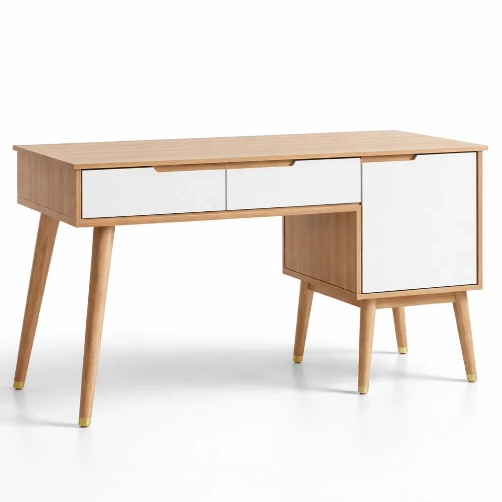 Comprend un bureau avec une surface de travail spacieuse, des tiroirs et un placard pour le rangement organisé.