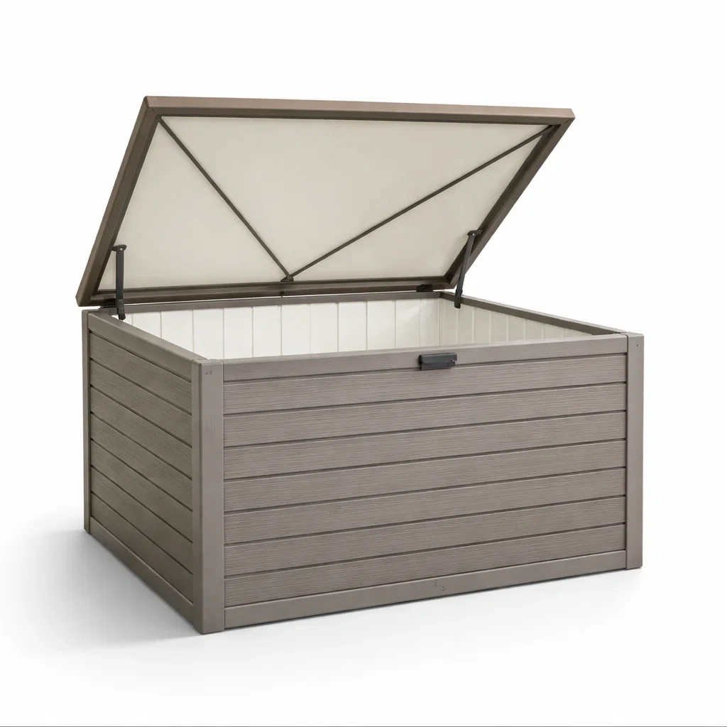 Boîte de rangement extérieure polyvalente pour stocker des coussins de jardin, jouets ou autres articles.