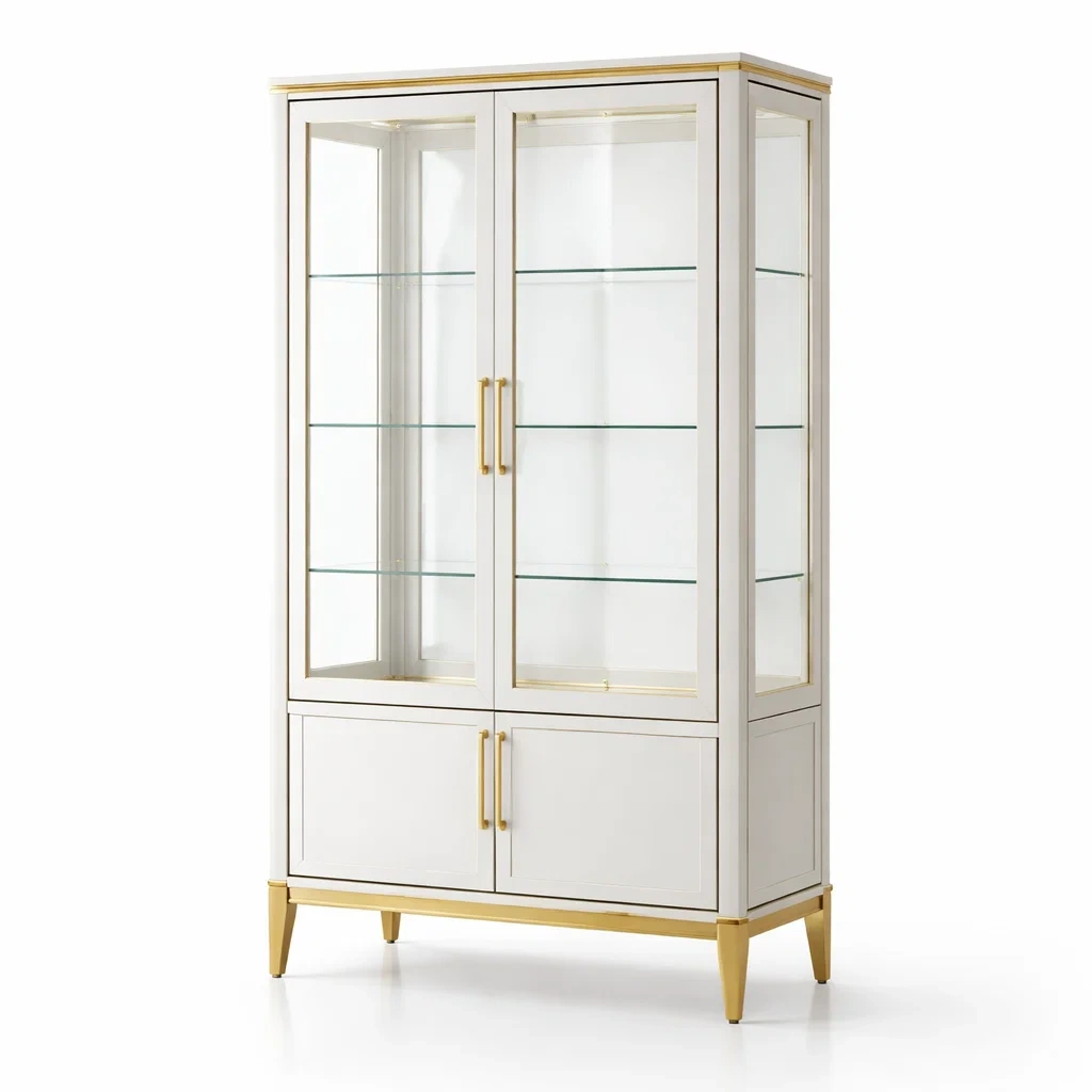 Cette vitrine est fabriquée en bois massif avec des portes en verre trempé. Elle est dotée d'étagères ajustables en verre transparent de 6 mm d'épaisseur. Les poignées et les pieds sont en métal doré.
