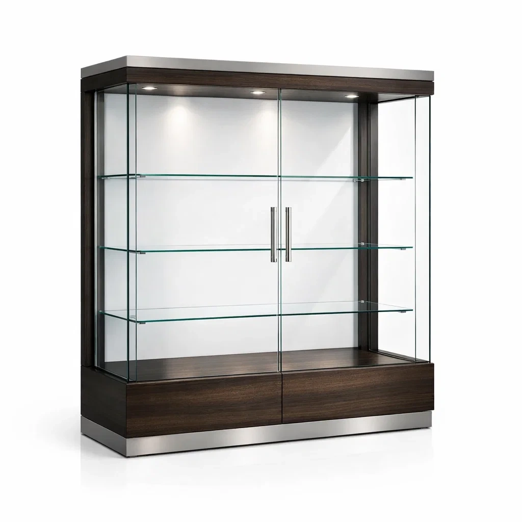 La vitrine est en verre trempé de 8 mm et sa structure est en bois stratifié avec des détails en acier inoxydable. Les dimensions sont de 200 cm de hauteur, 180 cm de largeur et 40 cm de profondeur. Elle est équipée de plusieurs étagères et d'un système d'éclairage intégré. Poids total : 150 kg.